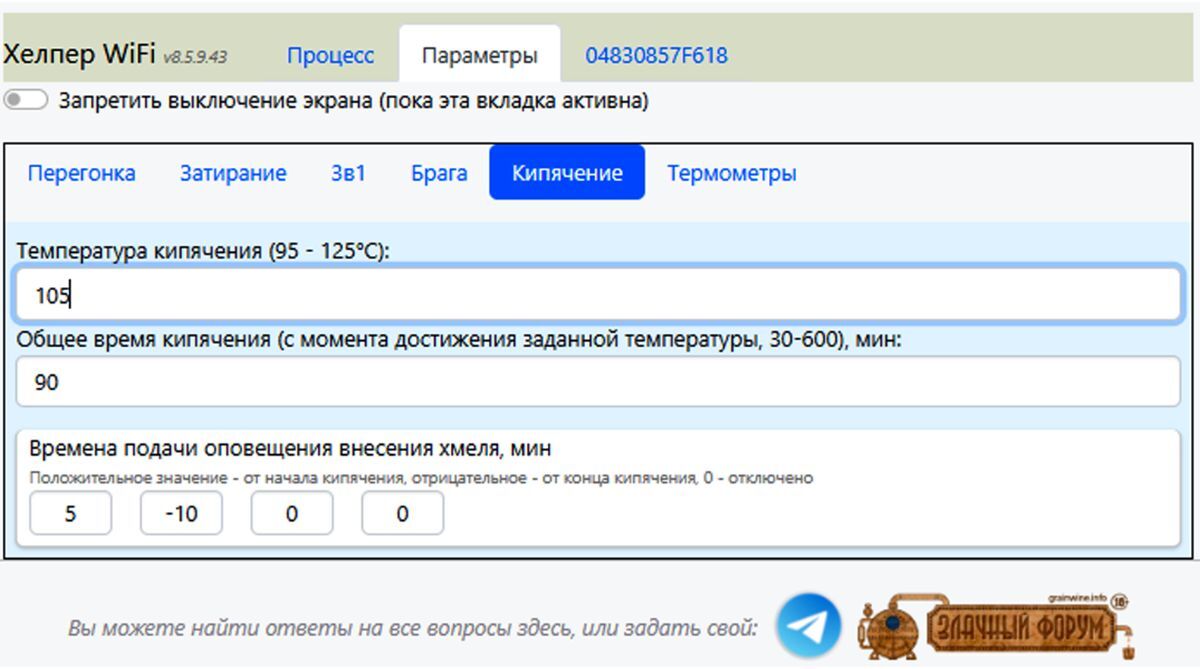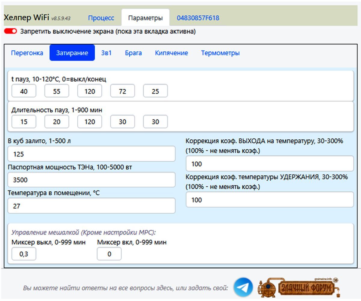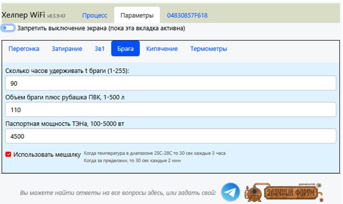 gas2007 Опубликовано 16 часов назад Опубликовано 16 часов назад (изменено) Хелпер Wi-Fi 4,5 кВт - автоматика с самонастраивающимся алгоритмом удержания температурных пауз, выполнения пяти пауз с прямым и обратным затиранием, кипячение с четырьмя временными интервалами, а также удержание температуры в процессе брожения на протяжении 10 суток. Кроме этого автоматика позволяет получать дистилляты и ректификаты в ручном и автоматическом режиме. Управление автоматикой происходит непосредственно с базового блока или через сайт в Интернете. Зайти на сайт управления автоматикой Хелпер Wi-Fi и посмотреть, как все устроено можно перейдя по ссылке https://vinokur-help.art Логин для входа на сайт – helper пароль - 1234 Режимы работы: 1. «Затирание» - автоматическое выполнение пяти температурных пауз с параметрами температуры и длительности пауз, приведёнными в разделе «Параметры», «Затирание». Можно использовать разгонный ТЭН большой мощности. 2. «Автонастройка затирания» - автоматическое нахождение необходимых параметров ПВК или Куба, обеспечивающих высокоточное удержание температурных пауз. Параметры режима указываются в разделе «Параметры», «Затирание». 3. «Варка» - автоматическое выполнение четырёх временных интервалов, оповещая винокура о необходимости внесения хмеля. Параметры режима указываются в разделе «Параметры», «Кипячение». Можно использовать разгонный ТЭН большой мощности. 4. «Брага» - удержание температуры брожения в заданном диапазоне при изменении температуры окружающей среды или естественного разогрева браги в процессе брожения. Максимальна длительность удержание температуры брожения 10 суток. Параметры режима указываются в разделе «Параметры», «Брага». 5. «Разогрев» - разогрев до нужной температуры содержимого ПВК или Куба, указанной в разделе «Параметры», «Перегонка». Можно использовать разгонный ТЭН большой мощности. 6. «Отбор» - отбор дистиллята или ректификата по заданному объёму или температуре, указанным в разделе «Параметры», «Перегонка». 7. «Спирт Головы» - отбор головных фракций по заданному объёму или температуре указанным в разделе «Параметры», «Перегонка» со скоростью задаваемой винокуром. 8. «Спирт Тело» - отбор питьевой фракции по заданному объёму или температуре указанным в разделе «Параметры», «Перегонка» со скоростью задаваемой винокуром. 9. «Спирт Авто 3в1» - полностью автоматический отбор Голов, Тела и Хвостов в едином цикле, с розливом по установленным ёмкостям. Параметры режима указываются в разделе «Параметры», «3в1». Кран регулировки скорости отбора должен быть полностью открыт. Можно использовать разгонный ТЭН большой мощности. В автоматике Хелпер WI-Fi при работе на ПВК или простом Кубе реализовано: 1. Управление работой автоматики как с базового блока автоматики Хелпер Wi-Fi так и удалённо, через сайт в Интернете. 2. Автоматическая стабилизация мощности нагрева ТЭНа, при изменяющимся входном напряжении сети, с точностью до 4 - 5%. 3 Использование дополнительного, разгонного ТЭНа любой мощности при разогреве содержимого ПВК или Куба в режимах автоматики – «Разогрев», «Затирание солода», «Варка» и «Спирт Авто 3в1». Включать ТЭН нужно непосредственно в сетевую розетку, мимо автоматики Хелпер Wi-Fi, а выключать по звуковому сигналу автоматики (Меню «Параметры», «Перегонка» - «Температура оповещения …»). 4. Автоматиче