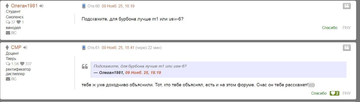 Alexx_Any Опубликовано 25 ноября, 2025 Опубликовано 25 ноября, 2025 21 минуту назад, Naruto сказал: Бурбон после брожения "фильтруют" Так у него же 100% солод. Какой там бурбон. 22 минуты назад, Naruto сказал: Но вот этот Олжека кажись уже всех угреб, я то не вижу чё он там пишет, но вы чего то все подорвались в глупые дискурсА Последую твоему совету. Но уж ловко нубом прикидывается-)))) 1