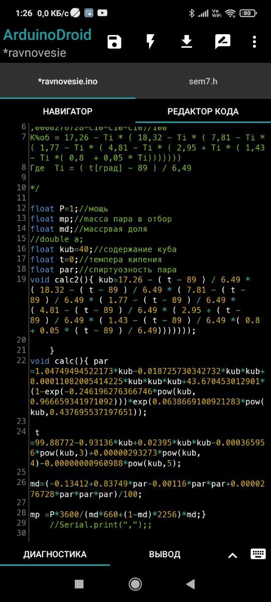 Виктрыч Опубликовано 3 часа назад Опубликовано 3 часа назад Понятно. Тогда так. Расчётная температура куба равна измеренной минус 0,035 * (760 - сумма давлений в ртути). Коэфф гуляющий, но примерно на глаз. Уточнить по месту можно из справочника. Спиртуозность в Кубе от расчетной температуры по Мекаоду К%об = 17,26 - Ti * ( 18,32 - Ti * ( 7,81 - Ti * ( 1,77 - Ti * ( 4,81 - Ti * ( 2,95 + Ti * ( 1,43 - Ti *( 0,8 + 0,05 * Ti))))))) Где Ti = ( t[град] - 89 ) / 6,49 Не самая точная , но другой прямой т. Есть более точная обратная, но её в обычный калькулятор не вставить. Если такой расклад устроит, продолжу завтра. Но сегодня пас. Днюха была. Туго соображаю. Если что в первой части с давлением не так, пусть поправят. У меня вроде работает. Упс. Нашёл скетч с твоими вопросами. Мне как бы всё понятно. Задавай вопросы. Дорога к обеду ложка, К ночи дорог унитаз.