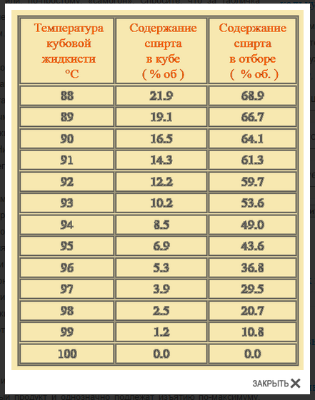 Виктрыч Опубликовано 11 февраля Опубликовано 11 февраля 2230 это теплота испарения килограмма воды в Дж по справочнику. 3600 это как раз 1 кВт в тех же джоулях. 660 это теплота ЛИТРА спирта. Так то в спрааочниках всё в кг и в моём 840 Дж/кг. Ну и если его плотность 0,8 не получается эти 660. Хрен знает. Увидел эту цифру где то и запомнил. Может какой нюанс. Один фиг это всё по месту уточнять. Расчётом определяю флажки, за которые нельзя. Стенку коридора. Нужно выйти на исходники хозяев калькуляторов. Нах самому изобретать велосипед не зная тонкостей. Лет 10 назад всё делились чем умели. Но что то пошло не так. В принципе можно было бы создать тему типа калькулятор, вшитый в автоматику. Давно этот вопрос назрел. Вмешиваться в процесс до того, как почки отпали. То есть градусник увидел то, что уже свершилось пять минут назад. Пс. Выше расчёт показал что с кило из куба при означенных условиях вылетает 2,7 л этанола. Ну там нужно откинуть на технологический запас флегмы пусть 30% . А где остальное? При отборе литр, а то и пол-литра с кило? К примеру НДРФ беру 2,3 л начальное с кВт по попугаю 93%. Пиши Андерсон. Потому что ни чего не мешаеся под ногами и между. Дорога к обеду ложка, К ночи дорог унитаз.