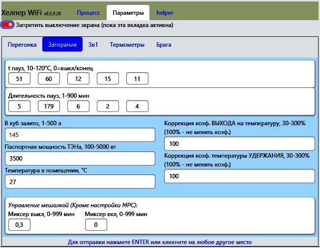 gas2007 Опубликовано 21 января, 2023 Опубликовано 21 января, 2023 (изменено) Хелпер Wi-Fi 4,5 кВт - автоматика процессов ректификации, дистилляции и варки пива с самонастраивающимся алгоритмом удержания температурных пауз при затирании солода и автоматическим фракционным отбором Голов, Тела и Хвостов с розливом по установленным ёмкостям. Для удобства наших клиентов мы создали многоуровневую систему управления автоматикой. Управлять автоматикой можно: - с базового блока автоматики, используя три кнопки и переключатель режимов работ; - удалённо, через сайт в Интернете https://vinokur-help.ru (Логин helper Пароль 1234), используя телефон, планшет или компьютер; - с домашнего компьютера, через "Домашний сервер", автоматически создаваемый автоматикой по желанию винокура. Ознакомиться с WEB интерфейсом, во всех деталях работы с ним, можно посмотрев ролик, перейдя по ссылке. Кликните, чтобы посмотреть. На 01.07.2025 ролик немножко устарел. Появились новые режимы "Спирт Авто 3в1", "Брага", "Кипячение" и управление Автоклавом. Автоматика v8.5.29 в ручном и автоматическом режиме позволяет изготавливать: 1. Спирт ректификат. 2. Дистиллят. 3. Пиво (затирание, кипячение, охлаждение). 4. Брагу (удержание температуры брожения в течении 10 суток) 5. А так же управлять Автоклавом для домашних заготовок. Всё, что касается приобретения автоматики и её стоимости читайте здесь Приобретение и стоимость Стоимость автоматики мы разделили в зависимости от используемых режимов работы: 1. Для удешевления её стоимости предлагается автоматика: - без фракционного разлива по тарам и отсутствия возможности включения этого режима дистанционно по Интернету; - без защиты от статического электричества и высоковольтных наводок на кабеля от датчиков и весов; - без возможности подключения бесперебойного источника питания как защиту от кратковременного пропадания сетевого напряжения. 2. Автоматика с полным функционалом, но без возможности автоматического розлива фракций по ёмкостям (розлив - временные ограничения, ждём комплектующие). 3. Автоматика с полным функционалом. Инструкция от 02.03.2026 Зайти на сайт управления автоматикой Хелпер Wi-Fi и посмотреть как все устроено можно перейдя по ссылке https://vinokur-help.ru Логин для входа на сайт – helper пароль - 1234 Режимы работы: 1. «Разогрев» - разогрев до нужной температуры содержимого ПВК или Куба, указанной в разделе «Параметры», «Перегонка». Можно использовать разгонный ТЭН большой мощности. 2. «Отбор» - отбор продукта по заданному объёму или температуре, указанным в разделе «Параметры», «Перегонка». 3. «Спирт Головы» - отбор головных фракций по заданному объёму или температуре указанным в разделе «Параметры», «Перегонка» со скоростью задаваемой винокуром. 4. «Спирт Тело» - отбор питьевой фракции по заданному объёму или температуре указанным в разделе «Параметры», «Перегонка» со скоростью задаваемой винокуром. 5. «Спирт Авто 3в1» - полностью автоматический отбор Голов, Тела и Хвостов в едином цикле, с розливом по установленным ёмкостям. Параметры режима указываются в разделе «Параметры», «3в1». Кран регулировки скорости отбора должен быть полностью открыт. Режим розлива фракций по тарам включается дистанционно по договорённости. Можно использовать разгонный ТЭН большой мощности. 6. «Брага» - удержание температуры брожения в заданном диапазоне при изменении температуры окр