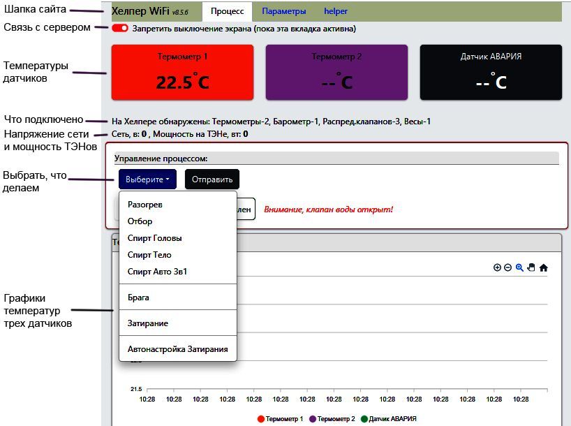 gas2007 Опубликовано 21 января, 2023 Опубликовано 21 января, 2023 (изменено) Хелпер Wi-Fi 4,5 кВт - автоматика полного цикла процессов ректификации, дистилляции и варки пива с самонастраивающимся алгоритмом удержания температурных пауз при затирании солода и автоматическим фракционным отбором Голов, Тела и Хвостов с розливом по установленным ёмкостям при управлением как с базового блока, так и через сайт в Интернете. Автоматика, по желанию винокура, позволяет самостоятельно обновлять программное обеспечение совершенно бесплатно и позволяет управлять всеми процессами как удалённо, через Интернет, так и с базового блока Хелпер Wi-Fi.. Ознакомиться с WEB интерфейсом, во всех деталях работы с ним, можно посмотрев ролик, перейдя по ссылке. Кликните, чтобы посмотреть. На 01.07.2025 ролик немножко устарел. Появились новые режимы "Спирт Авто 3в1" и "Брага". Всё, что касается приобретения автоматики и её стоимости читайте здесь Приобретение и стоимость Стоимость автоматики мы разделили в зависимости от используемых режимов работы: 1. Автоматика без фракционного разлива по тарам и отсутствия возможности включения этого режима дистанционно по Интернету. 2. Автоматика с полным функционалом и возможностью в течении месяца опробовать режим розлива по тарам или отказаться от него. 3. Автоматика с полным функционалом. Ответы на наиболее часто задаваемые вопросы вы найдёте по этой ссылке Покупателям.pdf Зайти на сайт управления автоматикой Хелпер Wi-Fi и посмотреть как все устроено можно перейдя по ссылке https://vinokur-help.art Логин для входа на сайт – helper пароль - 1234 Автоматика в ручном и автоматическом режимах позволяет изготавливать: 1. Спирт ректификат. 2. Дистиллят. 3. Пиво. Для этого в автоматике Хелпер WI-Fi при работе на ПВК или простом Кубе реализовано: 1. Управление работой автоматики как удалённо, через сайт в Интернете, так и с базового блока автоматики Хелпер Wi-Fi. 2. Автоматическая стабилизация температуры колонны перед началом процессов перегона. 3. Автоматическая стабилизация мощности нагрева ТЭНов независимо от напряжения сети. 4. Отбор продукта как по температуре, так и по объёму в старт-стопном и покапельном режимах. 5. Отбор Голов как в покапельном так и в высокоскоростном, полностью автоматическом режиме "Спирт Авто 3в1", что даёт десятикратное ускорение процесса отбора. Посмотреть результаты ГХ анализа ректификата можно ЗДЕСЬ. 6. Выбор того, что отбирать при работе в автоматическом режиме. (Только Головы; Головы и Тело; Головы, Тело и Хвосты) 7. Высокоточное удержание значения температурных пауз при затирании солода (4-е паузы). 8. Автоматическую настройку параметров затирания. 9. Учёт изменяющегося атмосферного давления на все процессы выполняемые автоматикой. 10. Удержание, на протяжении 10 дней, температуры брожения браги в диапазоне 25 - 28 градусов, при естественном разогреве браги или при нахождении ёмкости с брагой в неотапливаемом помещении (помещения с низкой температурой). 11. Автоматическое выполнение прямого затирания (с ростом температуры), обратного затирания (со снижением температуры) и смешанного затирания. 12. Автоматическое управление водяным охлаждением колонны при разогреве Куба и обратном затирании солода (при понижении температуры). 13. Изменение мощности ТЭНа в диапазоне от 10% до 100% в ручном и автоматическом режимах. 14. Ручная коррекция температур 